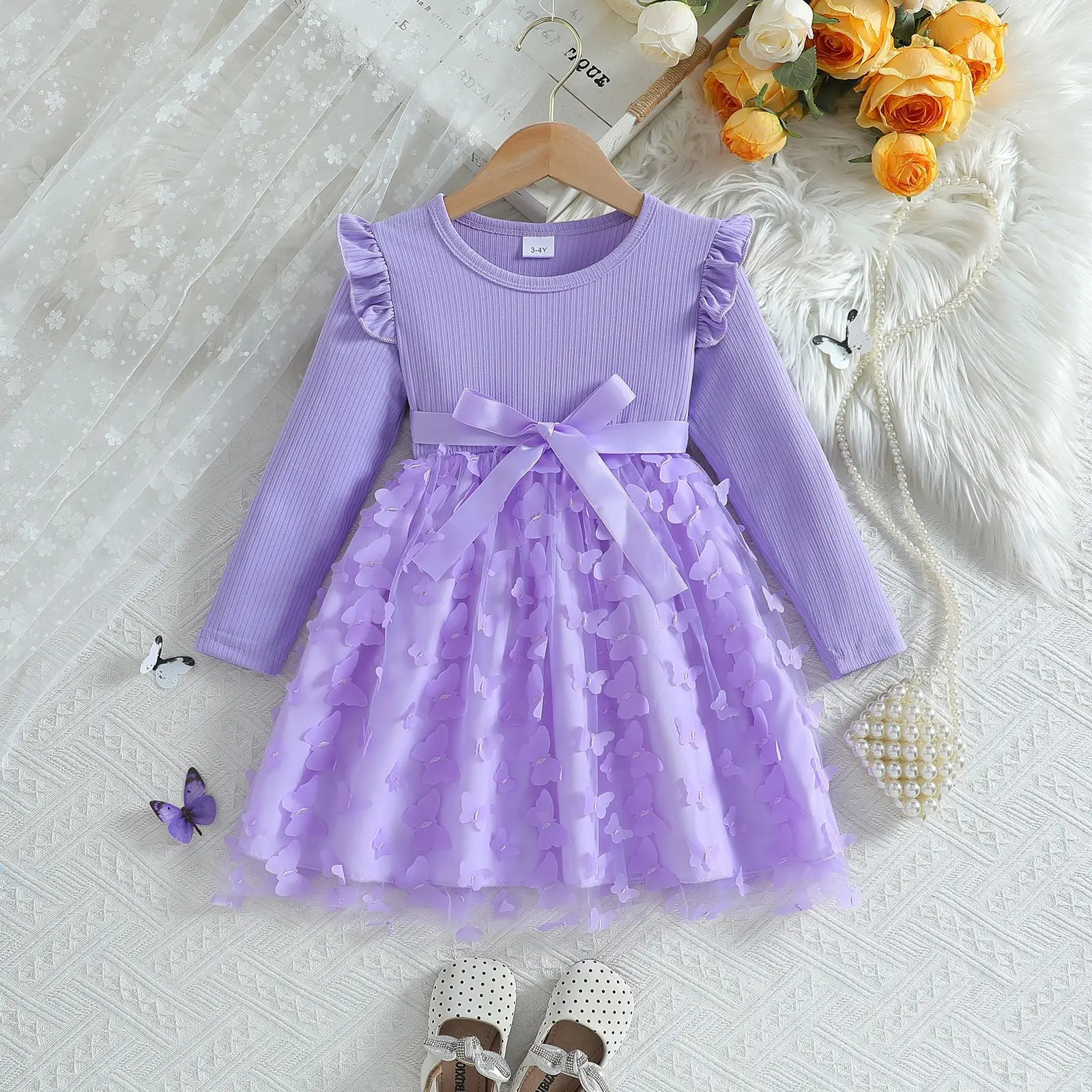 Adorned with three delicate butterfly embellishments, this dress is sure to delight any young girl.